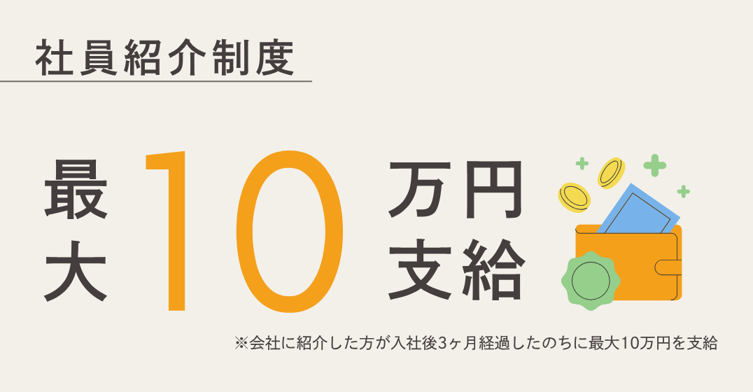 知り合いを会社に紹介していただくと、入社3ヶ月後に最大10万円支給しています。